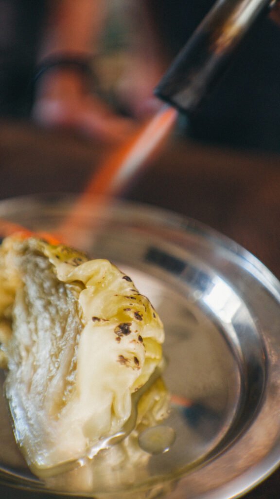 Kāpostu sagriež daivās nenogriežot kacenu, lai turas kopā. Skābu kāpostu sulā iemaisa cukuru, sāli, lai pastiprinātu tā garšu. Skābu kāpostu sulu lej vakummaisā – uz vienu kāposta daivu 50g sulas. Gatavo cirkulatorā 4h 82 grādu temperatūrā.
