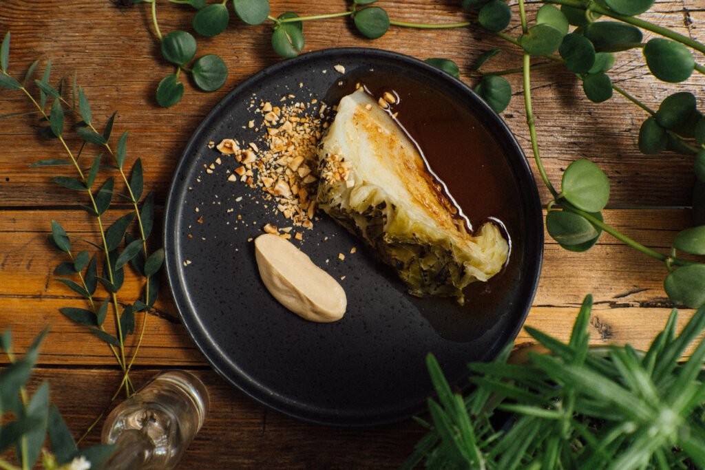 Uz šķīvja kārto kāpostu, pārlej ar karamelizēto sviestu un pievieno biezeni.
